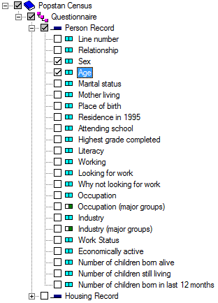 The dictionary tree on the left shows you the levels, identification items, records, and items contained in the data file. You can expand any part of the tree by pressing the '+' symbol. To select an item for export, click on the tickmark for the item. A tickmark will appear for selected items. Clicking on a selected item will deselect that item. Clicking on a record, will select all the items contained in the record.