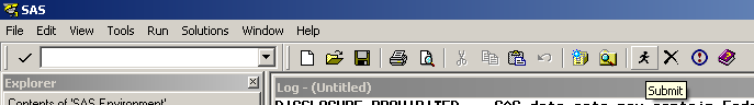 To run the file, click the submit button below the menu in the main SAS window. If the file is run without error, then SAS will display the number of observations and variables in the SAS data file, and the data file will be in the Library's user folder in the SAS explorer window. SAS automatically saves the data as a native SAS data file (.sas7bdat) in your local folder.