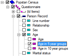 - Choosing an item automatically selects all lower level items contained within that item. For example, choosing "Person Record" will select all fields and value sets in the person record; choosing the field "Age" will select all the value sets for age.