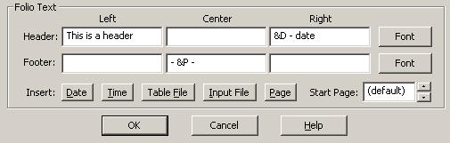To place predefined text in a text box, you can either type it directly or click in the text box where it should go and then click the button corresponding to the desired item. Predefined text strings may be mixed with other text, as in the right header of the example above. To delete text in the header or footer, delete it from the corresponding edit box.