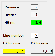 In the following operator-controlled example, Province and District are persistent, which means that their values were carried over from the previous case. The operator keyed HH No. through CY Income, then backed up to Line number. The PY Income field is protected and has been filled in via logic in the program.