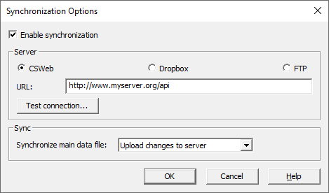 - URL: Specify the URL of the CSWeb server or the URL of the FTP server. For CSWeb servers the URL should start with http:// or https://. For FTP servers the URL should start with ftp://, ftps:// or ftpes://. The URL is not used for Dropbox.